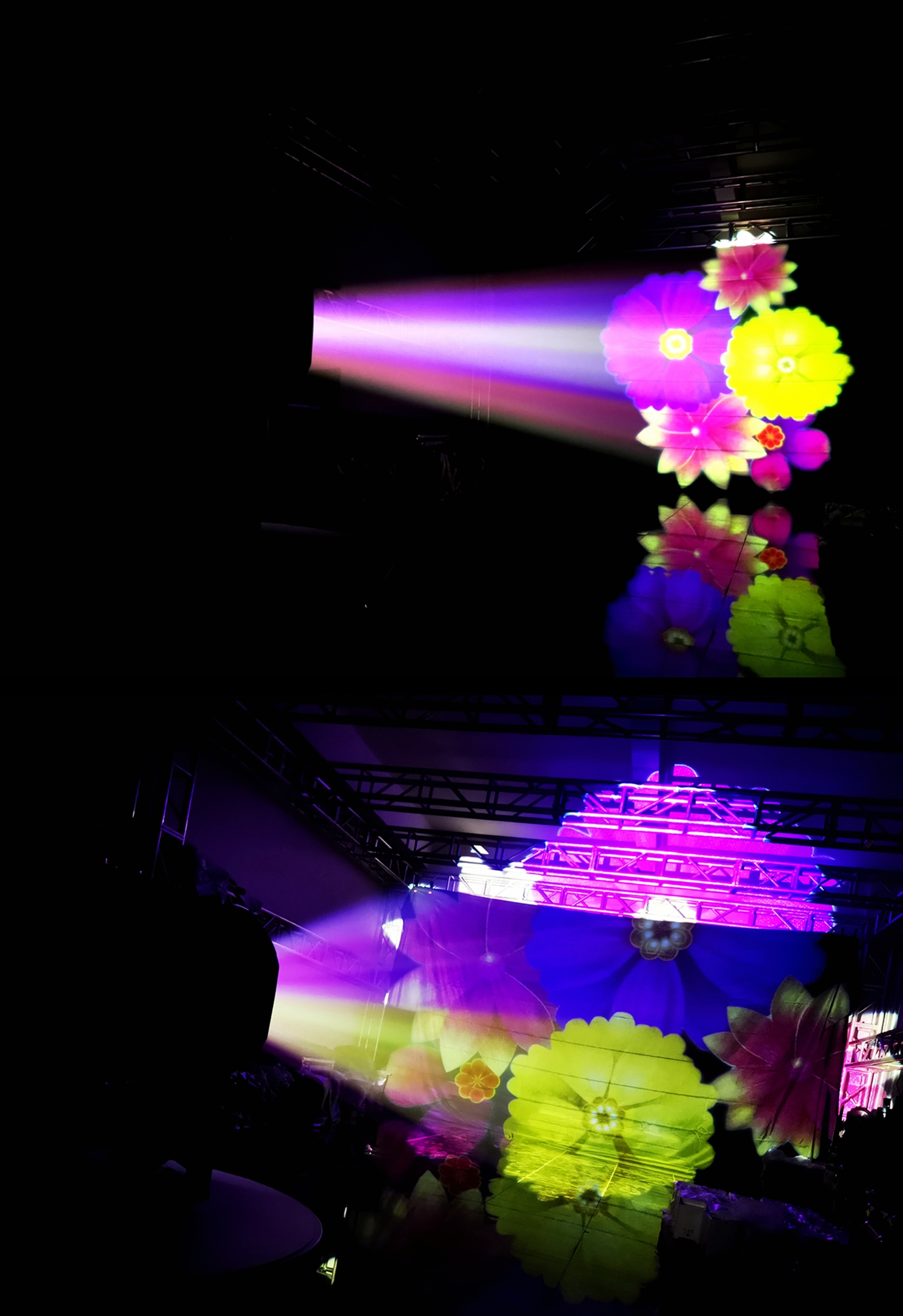 - Rotating pattern disk with adjustable speed for dynamic effects.